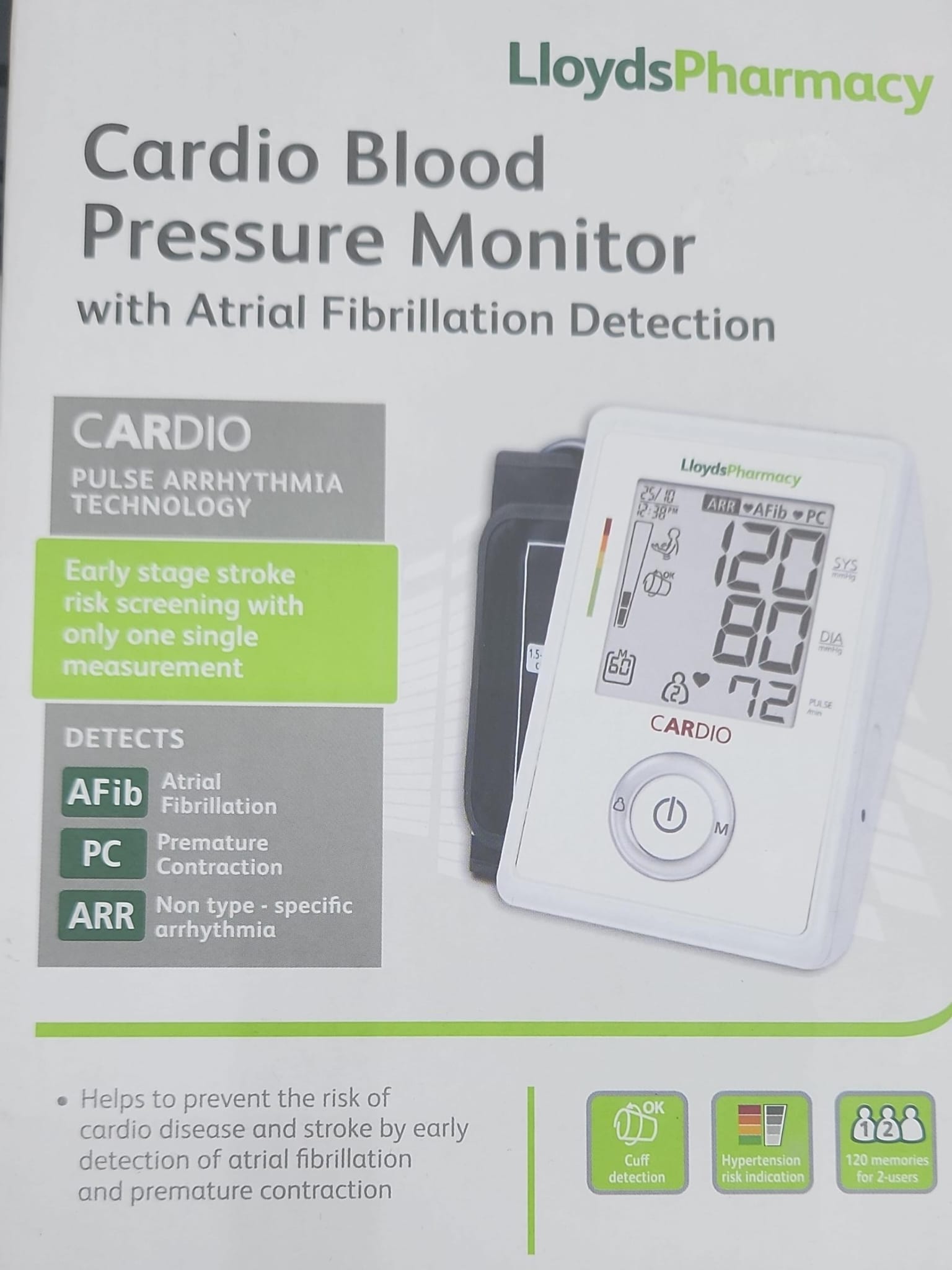Cardio Blood Pressure Monitor Lloyd’s pharmacy cardio blood pressure monitor with atrial fibrillation detection.